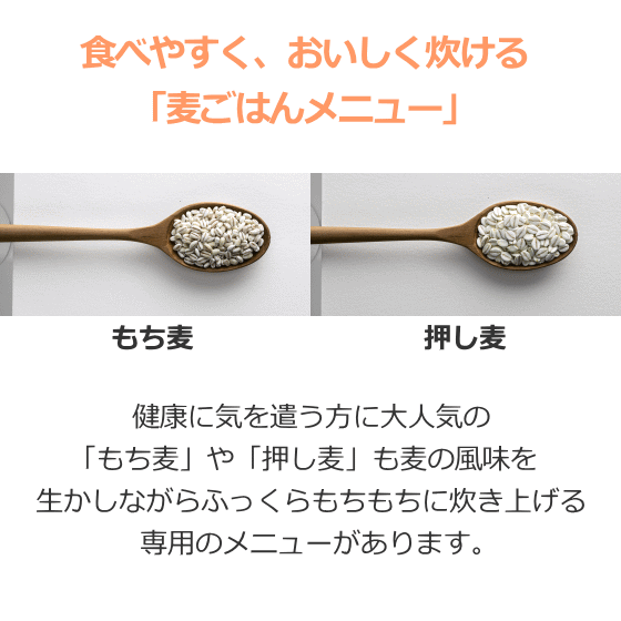 ■新機能! 麦ごはんメニュー 健康に気を遣う方に大人気の「もち麦」や「押し麦」も麦ごはんの ぱさつき感をおさえ、麦の風味を生かしながらふっくらもちもちに 炊き上げる専用のメニューがあります。