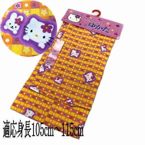 【送料無料】ゆかた こども サンリオ ハローキティ 浴衣 女の子 オレンジ 110cm 5才から6才用 子供 日本製生地使用 チェック柄 綿 夏 祭り 着物 ジュニア キッズ かわいい おしゃれ じんべい キティちゃん はろうきてい 適応身長105cm〜115cm