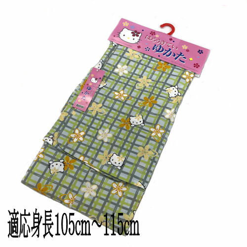 【送料無料】ゆかた こども サンリオ ハローキティ 浴衣 女の子 グリーン グレー 110cm 5才から6才用 子供 日本製生地使用 チェック柄 綿 夏 祭り 着物 ジュニア キッズ かわいい おしゃれ キティちゃん はろうきてい 適応身長105cm〜115cm