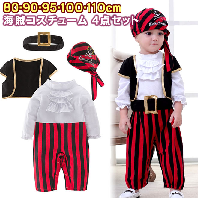 ■「メール便」送料無料■ハロウィン カバーオール コスプレ ≪ベビー キッズ 海賊 コスチューム セット ≫ロンパース ベスト ベルト 帽子 4点セット 仮装 変身 なりきり パレード 劇 役 パイレーツ カリブ バイキング 船長 キャプテン つなぎ どくろ 赤 黒