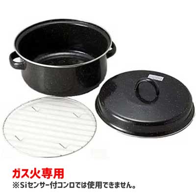 ▽商品の仕様 サイズ(約) 幅295×奥行240×高さ160mm 重量(約) 770g 材質 本体・蓋:ほうろう用鋼板(底の厚さ0.8mm) アミ:鉄(クロムめっき) 表面加工 ほうろう 対応熱源 ガス火専用※Siセンサー付コンロでは使用できません。