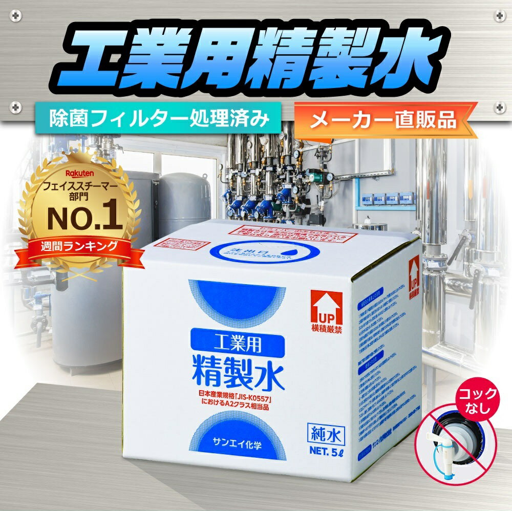 サンエイ化学 精製水 工業用 精製水 5L×1箱 コックなし 業務用 大容量 | 【送料無料】 アロマ スチーマー用 歯科 クーラント液 ウォッシャー液 アルコール 消毒液 無水 エタノール 除菌スプレー 除菌水 希釈水 洗浄 純水 蒸留水 イオン交換水 超純水 せいせいすい 日本製