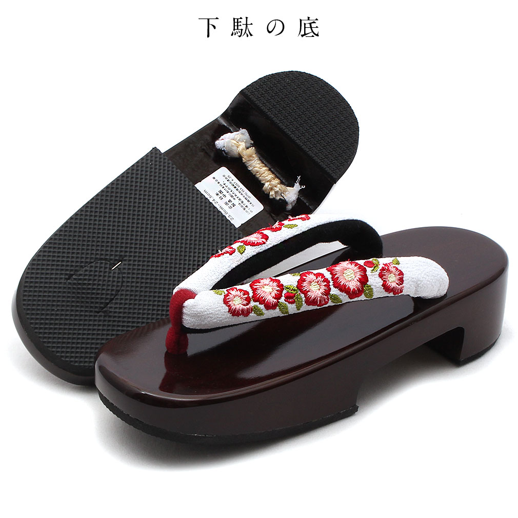 色 下駄台:茶塗 花 緒:白・赤 柄 椿刺繍 素材 下駄台:桐 サイズ フリーサイズ(適応サイズ23〜24.5cm) 長さ:約24cm 幅:約8cm 高さ:約4.5cm (つま先〜前坪:約3.5cm 前坪〜かかと:約20cm) 製造 企画:日本 製造:中国 備考 ※実際の商品と同じ色合いに画像修正をしておりますが、環境やモニターの違いにより多少色の違いが出て来ることがあります、ご了承ください。