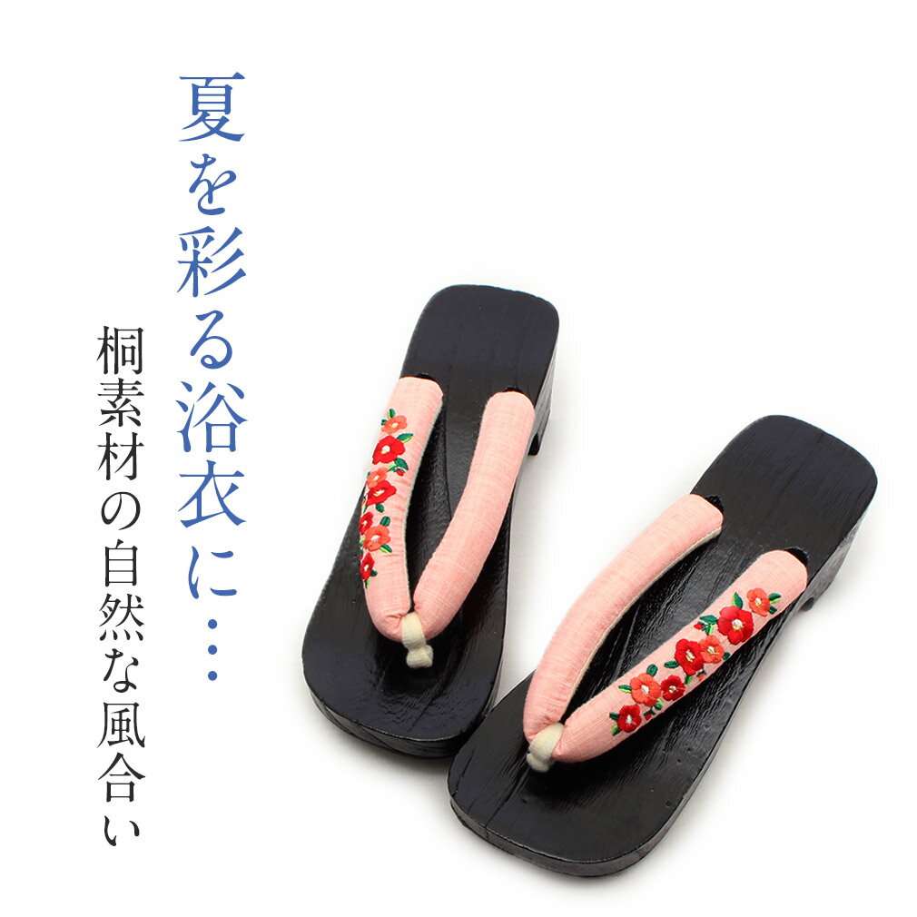 ◆お洒落ヒール桐下駄【フリーサイズ/Lサイズ】◆ 涼しげな桐素材の下駄台に、椿刺繍を施した花緒を使用したお洒落桐下駄です。